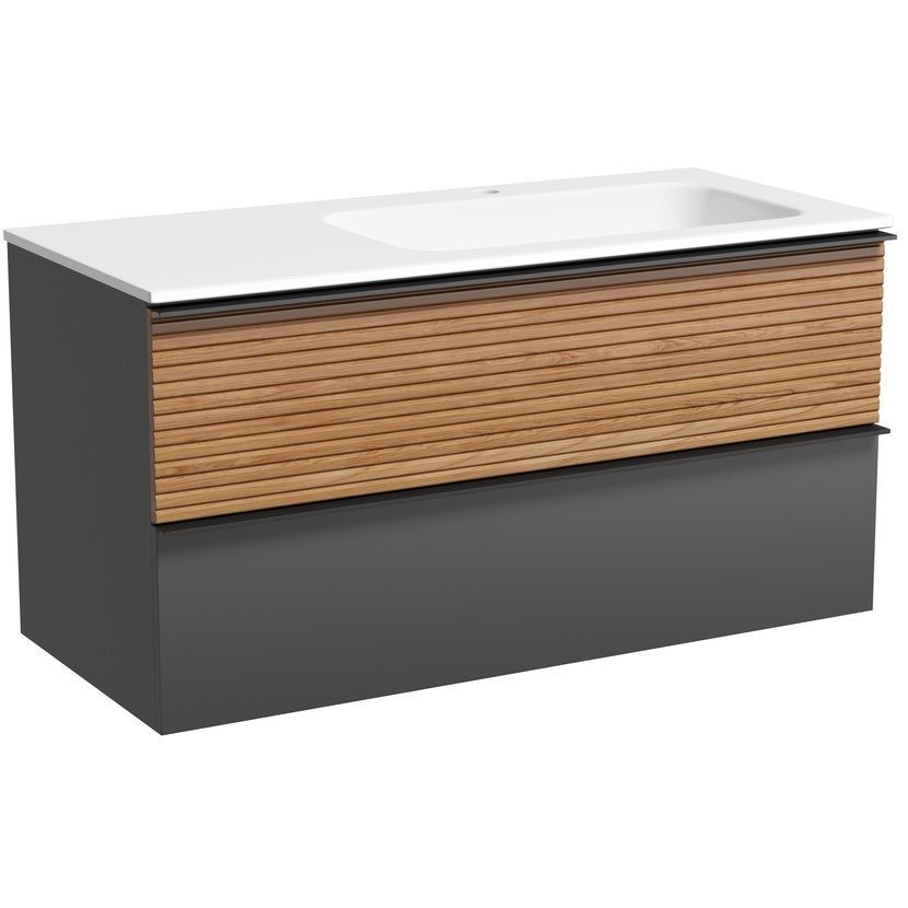 Тумба подвесная Delta c двумя ящиками оснащенными доводчиками скрытого монтажа с системой плавного закрывания и черными профильными накладными ручками. Каркас и фасад тумбы выполнен из МДФ, покрытие ПВХ - пленка в цвете «дуб красный/графит». Раковина керамическая с глубокой чашей. Раковина в комплект не входит и приобретается отдельно. Тумбу можно доукомплектовать столешницей с умывальником-чашей.