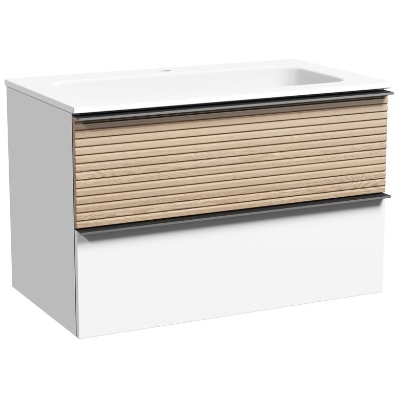 Тумба подвесная Delta c двумя ящиками оснащенными доводчиками скрытого монтажа с системой плавного закрывания и черными профильными накладными ручками. Каркас и фасад тумбы выполнен из МДФ, покрытие ПВХ - пленка в цвете «дуб светлый/белый». Раковина керамическая с глубокой чашей. Раковина в комплект не входит и приобретается отдельно. Тумбы шириной 80 и 100 см можно доукомплектовать столешницей с умывальником-чашей.