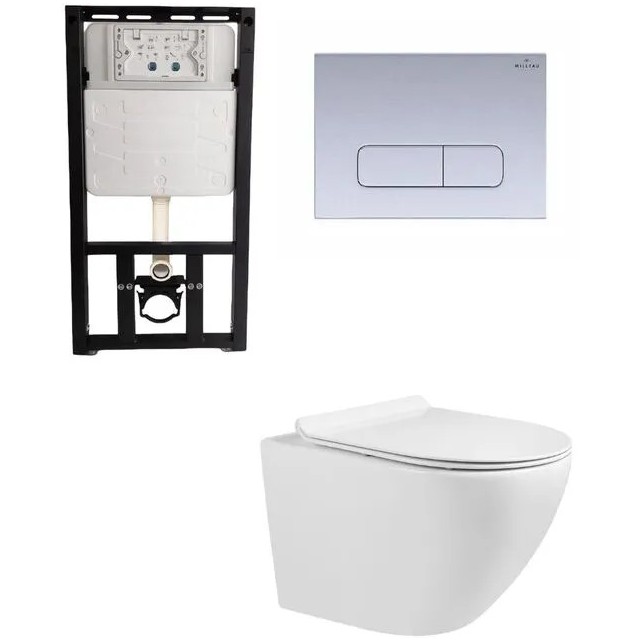 Комплект из инсталляции и подвесной унитаза с крышкой-сиденьем. В комплекте панель смыва хром матовый.