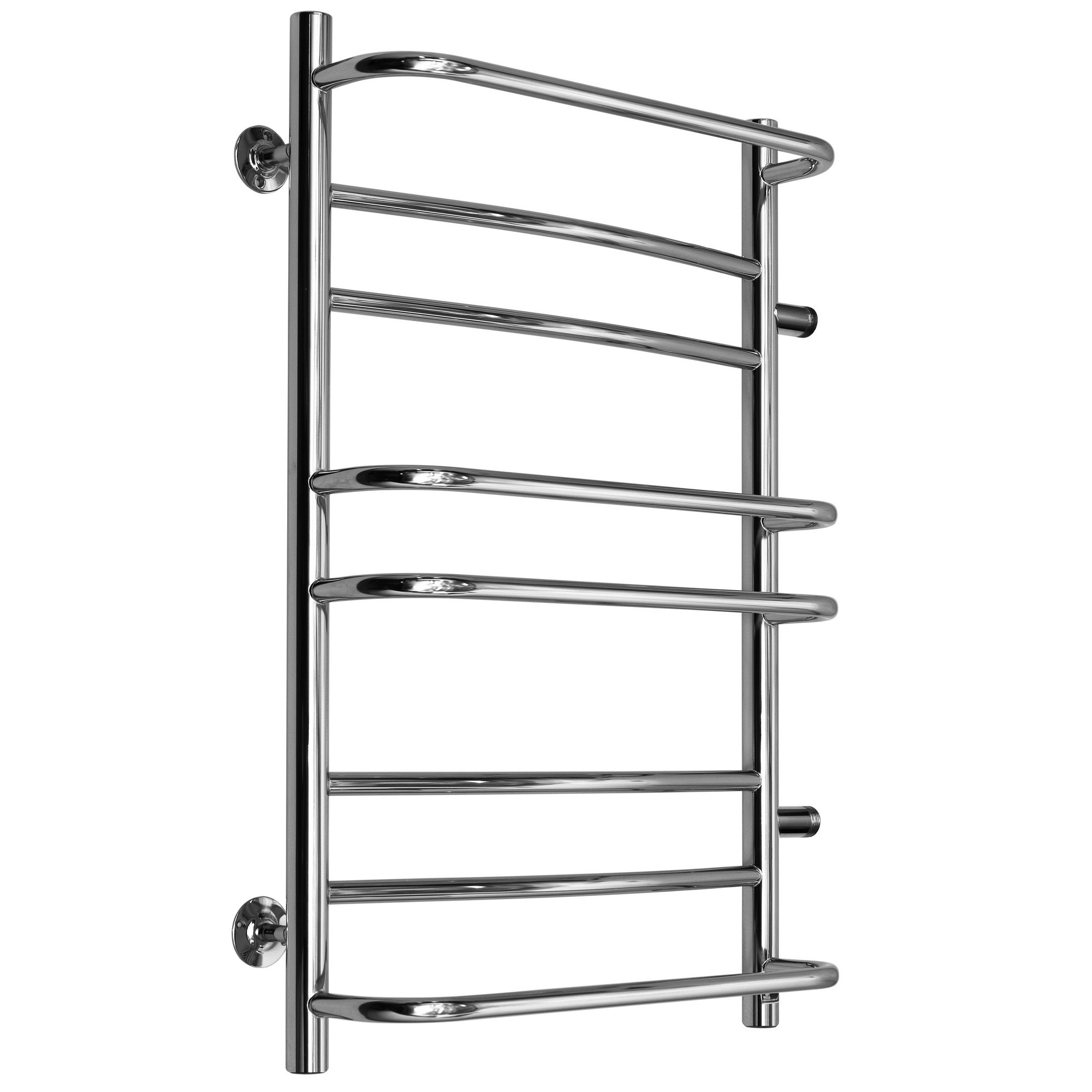 Водяной полотенцесушитель из нержавеющей стали в виде лесенки с четырьмя полками, перекладины в виде дуги, полки в виде скобы. Тепловая мощность: 366, 464 Вт.
