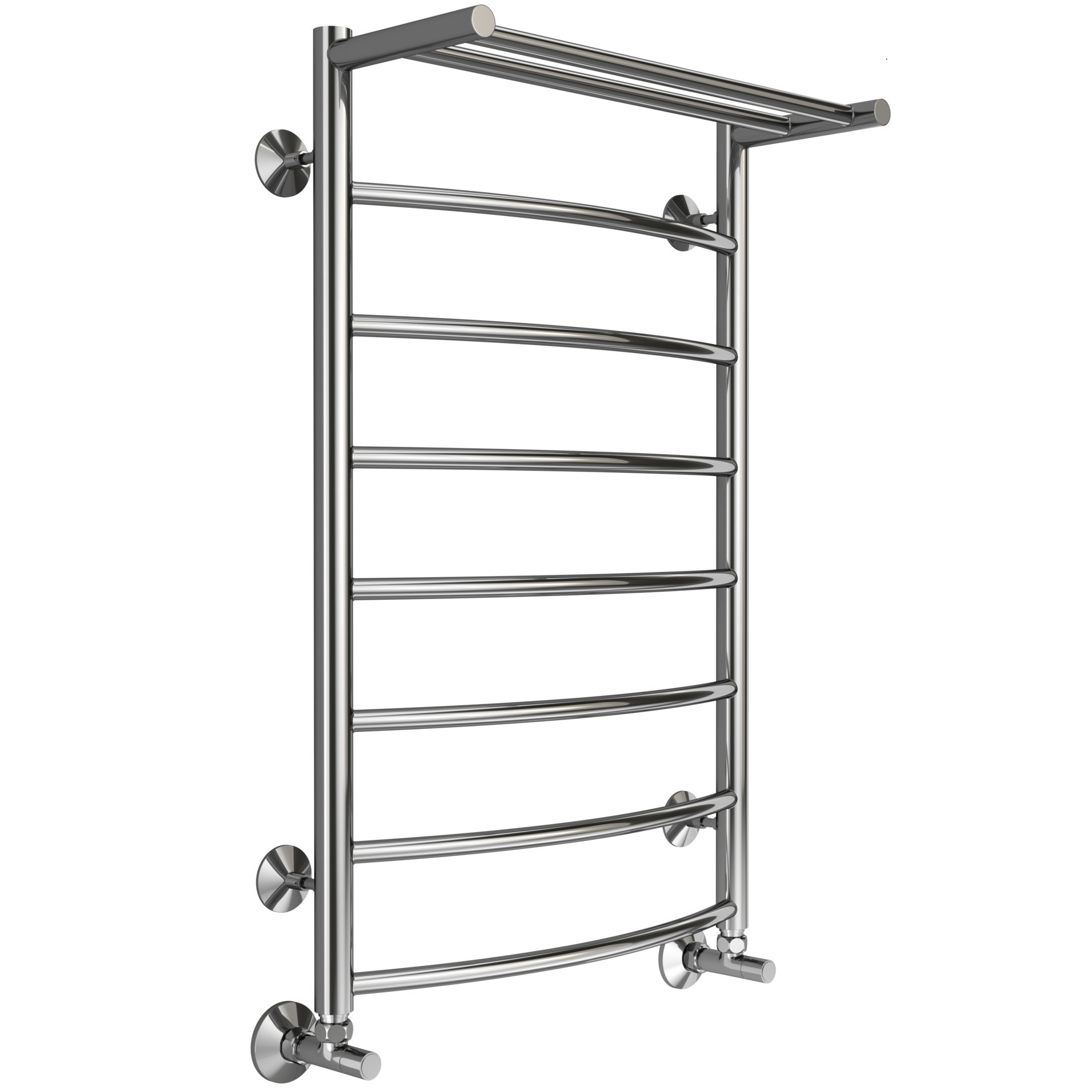 Водяной полотенцесушитель из нержавеющей стали с дугообразными перекладинами. Комплектация: заглушка под декоративным колпачком - 1 шт, кран Маевского - 1 шт, телескопическое крепление - 4 шт.
