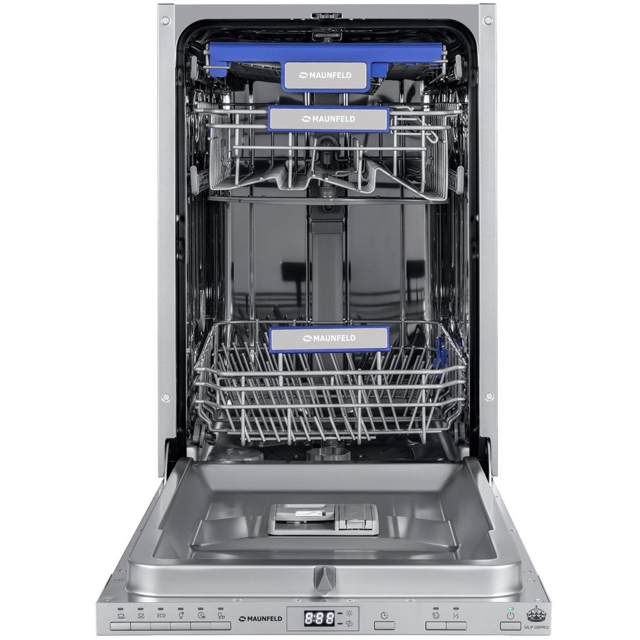 Узкая встраиваемая посудомоечная машина с системой индикации "Луч на полу". Высокая эффективность использования внутреннего пространства благодаря специальным корзинам. 10 комплектов для загрузки. 6 программ. 3 корзины.