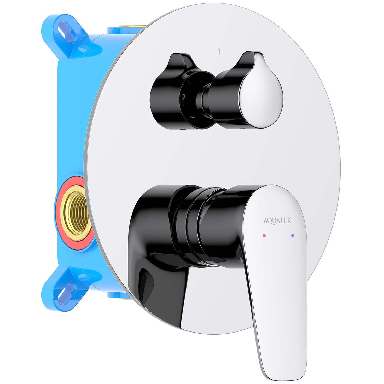 Однорычажная система регулировки силы струи и температуры воды. Цельный корпус смесителя снижает вероятность протечек. Декоративная пластина 3 мм из нержавеющей стали. Поворотный переключатель на душ. Лейка и шланг в комплект не входят. В комплекте: смеситель из латуни с установочной коробкой на 2 потребителя (внешняя и скрытая часть), декоративная накладка на стену из нержавеющей стали 3 мм.