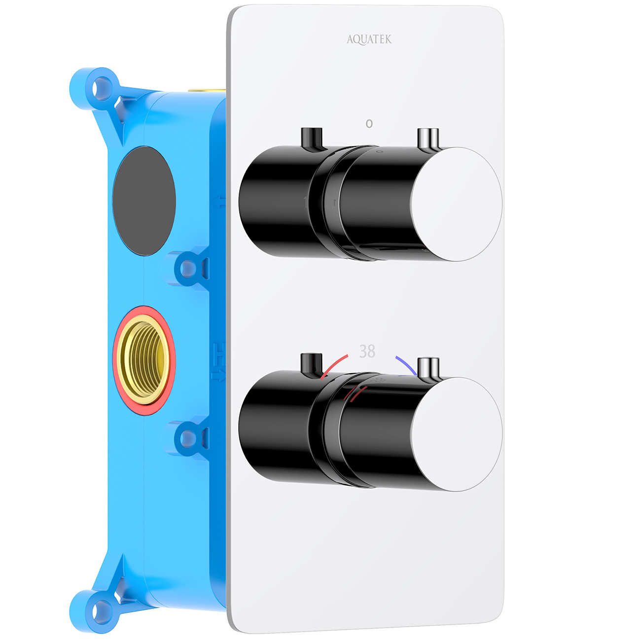 Встроенная функция включения/выключения. Ограничение температуры. Цельный корпус смесителя снижает вероятность протечек. Декоративная пластина 3 мм из нержавеющей стали. Поворотный переключатель на душ. Лейка и шланг в комплект не входят. Комплект поставки: смеситель из латуни с установочной коробкой на 2 потребителя (внешняя и скрытая часть), декоративная накладка на стену из нержавеющей стали 3 мм, душевой гарнитур приобретается отдельно.